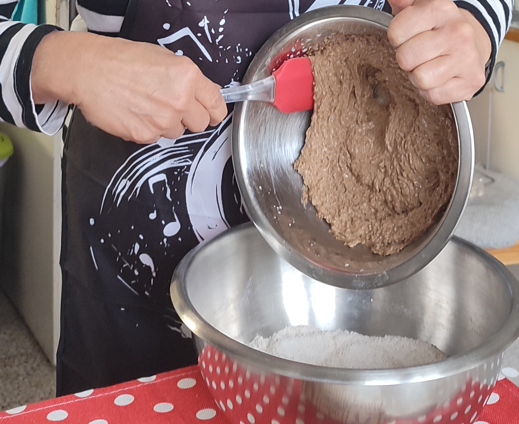 Umutiti šećer i puter dok se ne sjedine, zatim dodati pripremljenu mešavinu začina. U tu smesu sam dodala mleko, izmešala pa onda sve preselila u suvu smesu (brašno, so i sodu bikarbonu) i mešala spatulom dok nisam dobila testo. Mada je preporuka bila da se testo mesi na čistoj površini dok ne postane glatko – tu preporuku zanemarila jer ovakva vrsta testa „ne voli“ da se mnogo mesie. Zato sam ga samo oblikovala i umotala, a potom stavitla u frižider. Testo na hladnom treba da provede najmanje tri sata, a najviše tri dana.